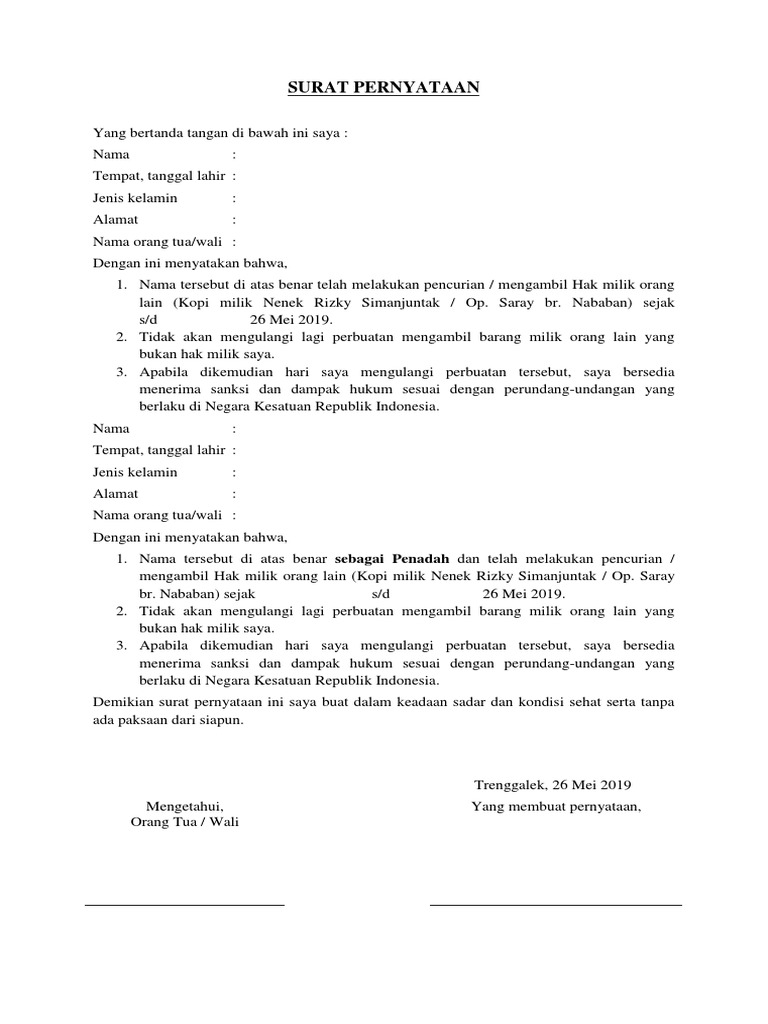 Contoh surat pernyataan tidak melakukan kesalahan kembali. Check spelling or type a new query. We did not find results for: Maybe you would like to learn more about one of these?
